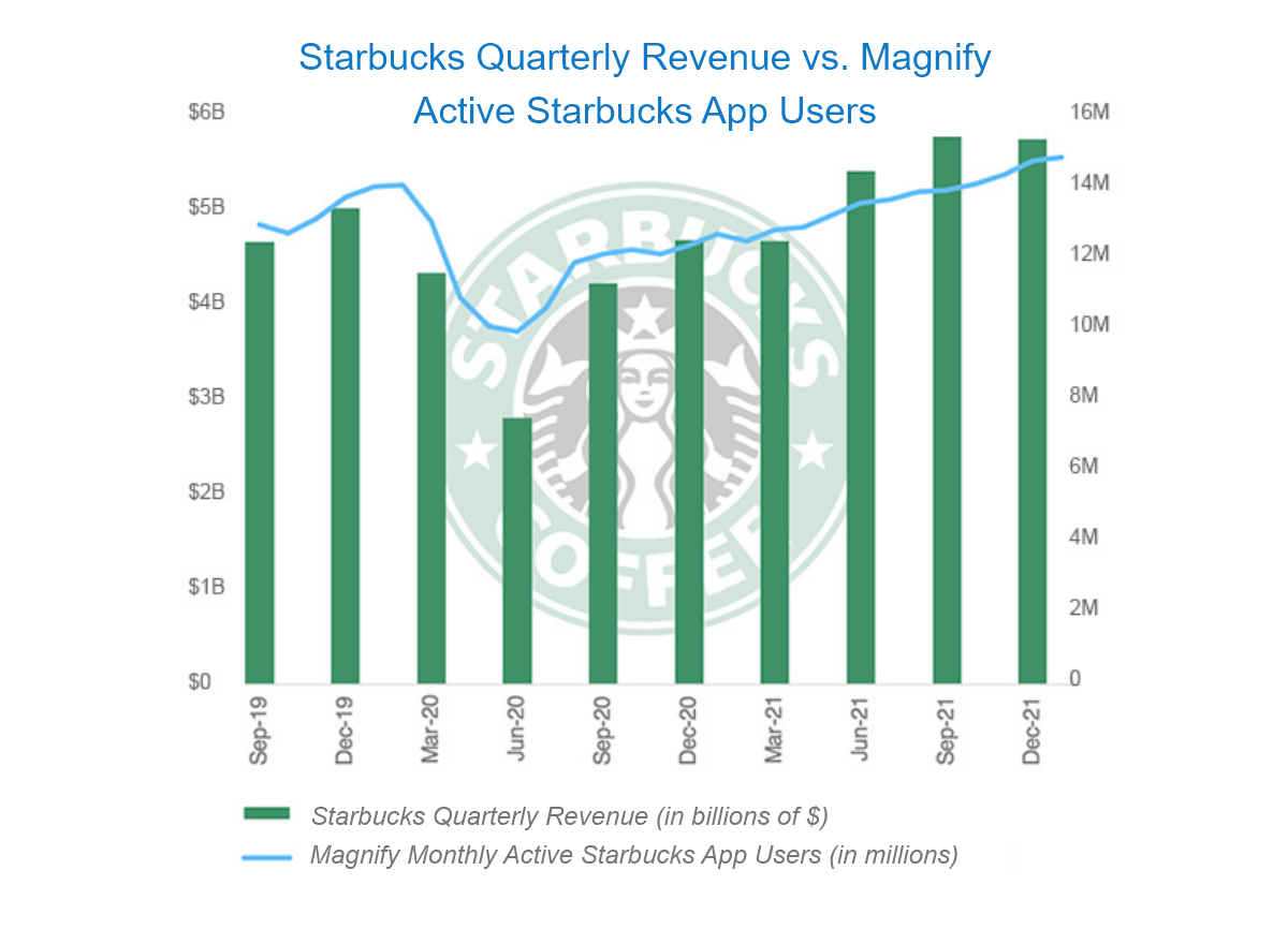 Starbucks quarterly revenue VS. Magnify active Starbucks app users.
