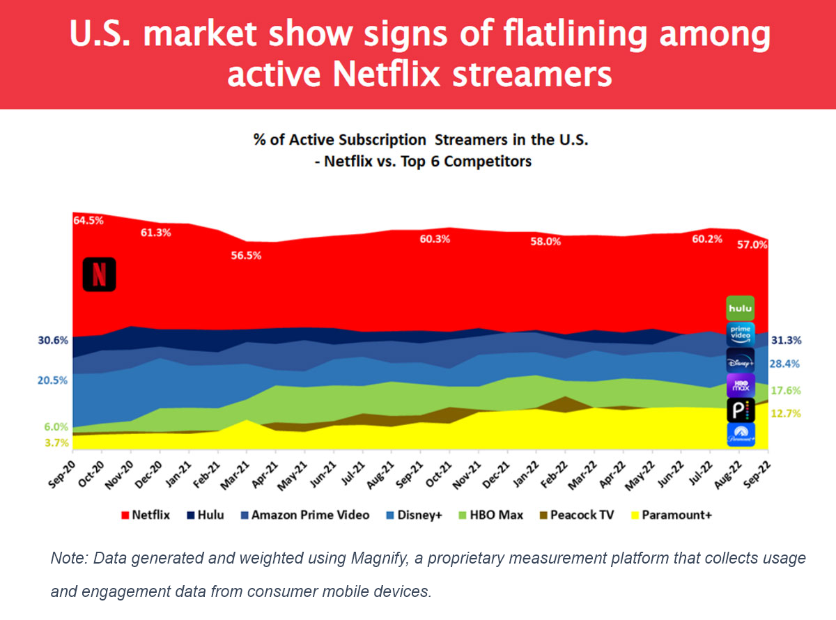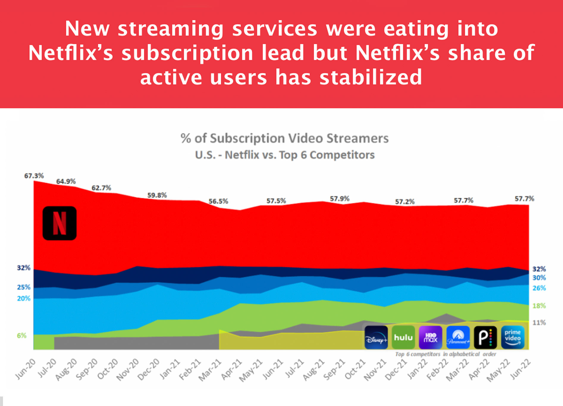 Netflix’s market share of active streamers has shown little movement compared to other streaming platforms.