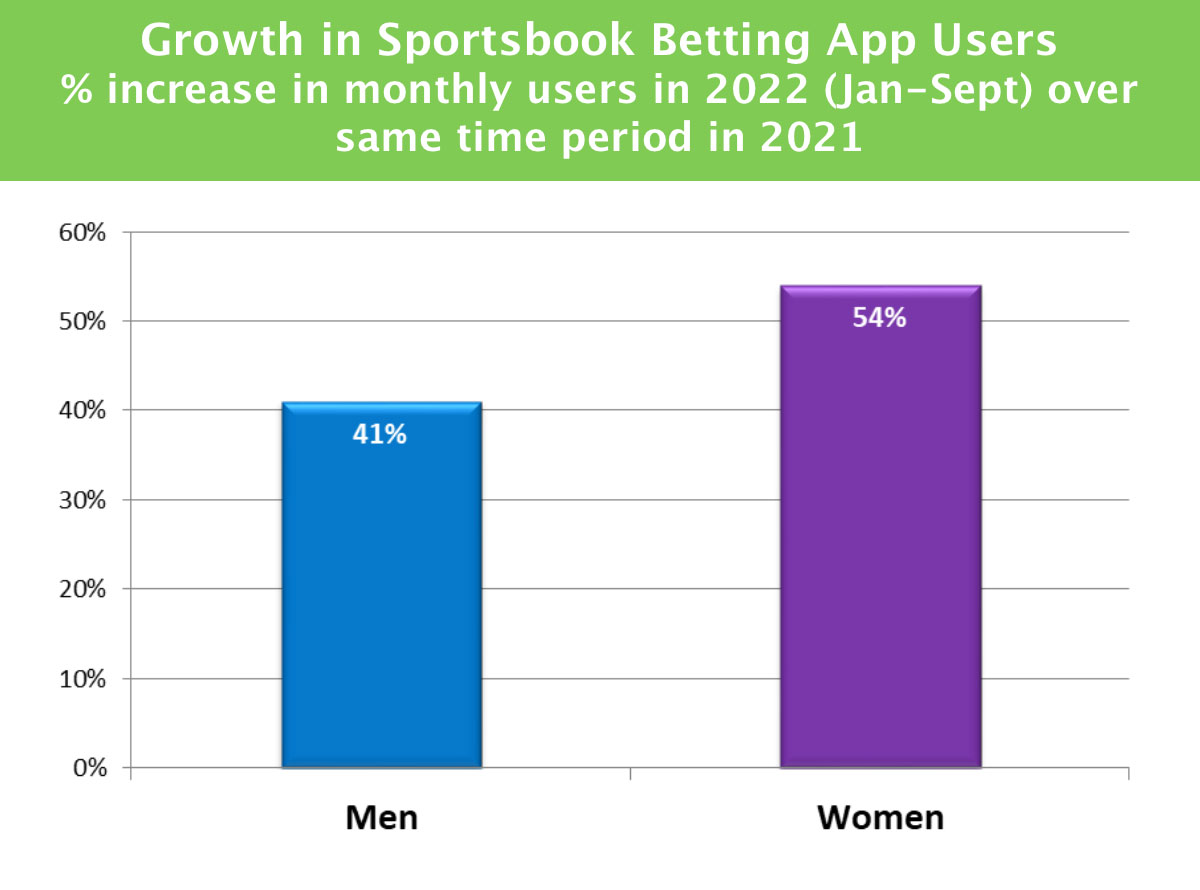 Through September 2022, the number of women using sportsbook betting apps is up 54%, while men have increased by 41% over the same time period.
