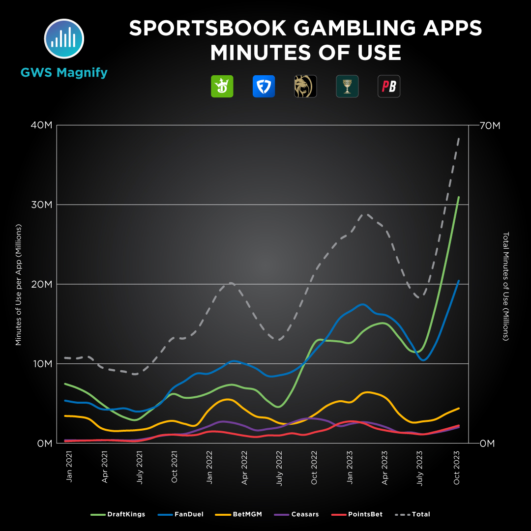 Mobile app analytics data from GWS Magnify reveals that sportsbook betting has attracted a surge in young users.